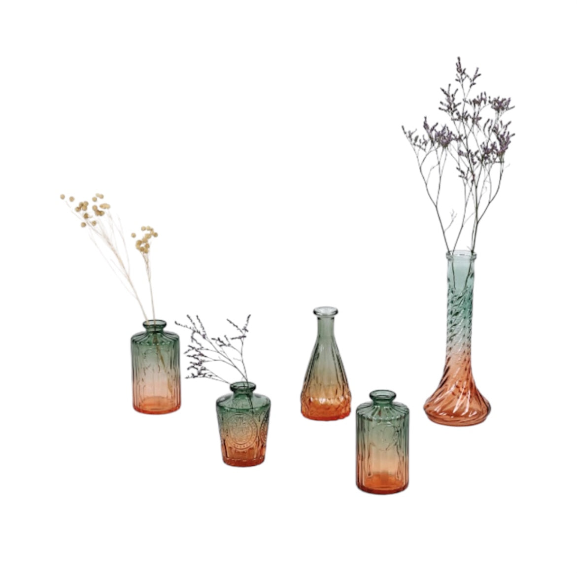 Raffinato set composto da 5 vasi in vetro lavorato con sfumatura blu scuro e rosa, perfetto per aggiungere un tocco di eleganza e colore agli ambienti. Ogni vaso presenta una lavorazione e una forma differente, ideali per creare composizioni floreali o per essere esposti singolarmente come elementi decorativi. Un connubio di design moderno e charme vintage, perfetto per salotti, allestimenti e vetrine.